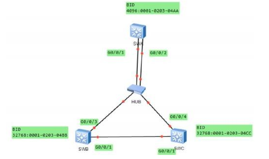 524.三台二层交换机与一台 HUB 互连,交换机均开启 STP,桥 ID 参照下图,其他配置默认,错误的是?()