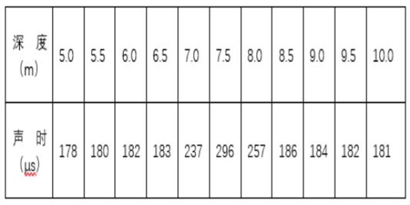 题目23.桩直径为800mm,埋声测管2根,管净距为670mm,测得5~10m声时值如下表,利用PSD数据分析该桩可能出现的缺陷范围。( )