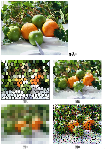 1、[49].如图所示,原稿执行菜单中的【滤镜】/【像素化】/【晶格化】命令后可以得到()所示的效果。