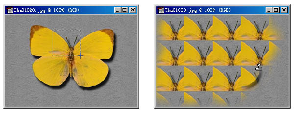 1、[12].在原稿(左图)中选取一个局部定义为图案后,应用下列选项中的()可以得到如右图所示的(蝴蝶图形)整齐重复排列效果。