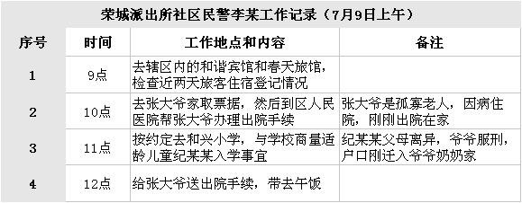 100、下表是某市公安局荣城派出所社区民警李某7月9日上午深入社区开展工作的记录,从表中记载的内容看,民警李某当天上午主要的工作内容是( )。