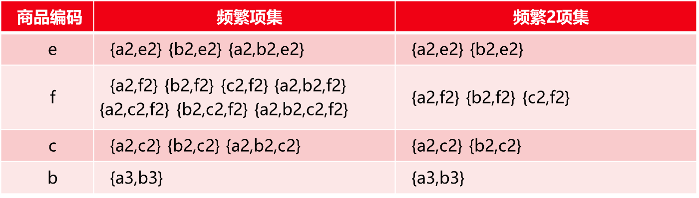 (2)删除频数小于最小支持度的商品,剩下的商品称为频繁项。已知最小支持度S_min=2,则删除S < 2的商品d和k,在此基础上,对原数据按支持度重新排列,获得新的集合单数据: