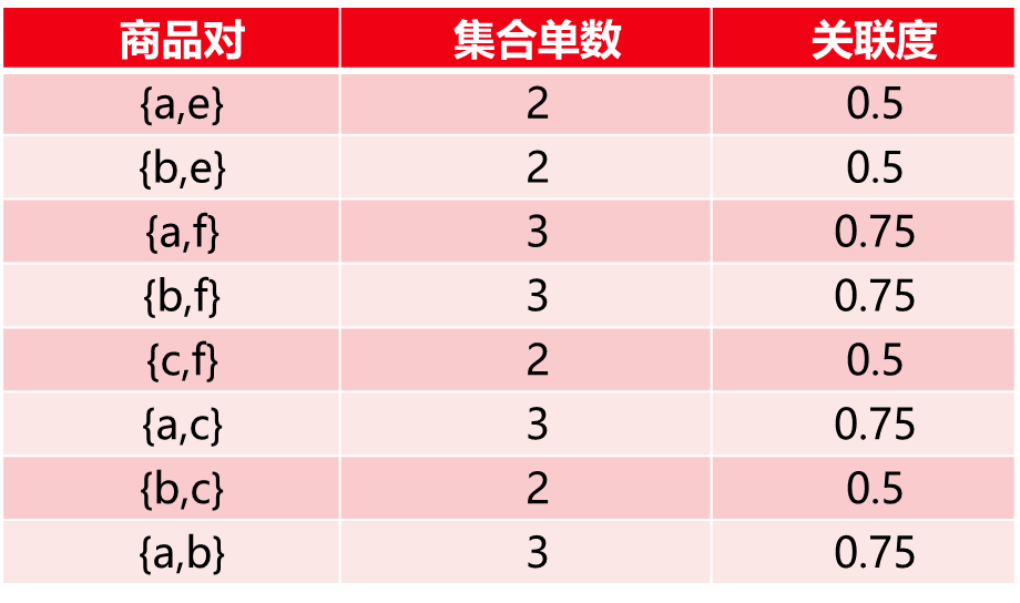 3、假设已有历史集合单的数据如下表所示,最小支持度S_min=2,频繁项集最大项数N=2,定义每一对商品的关联度为商品对存在的订单数量占订单总数的比例。应用FP树的方法计算商品关联度。