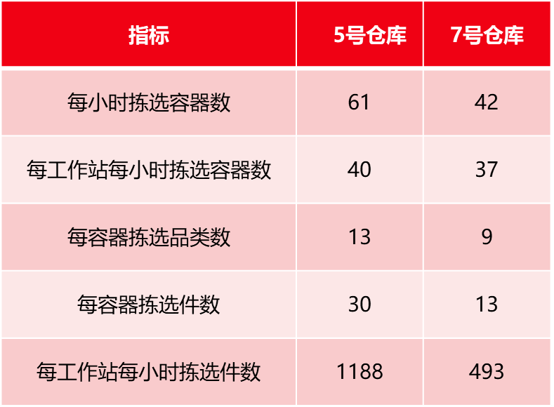 (3)两个仓库的拣货效率指标如下表所示,其中,5号仓库的品类为数码3C,商品件型较小,且单均件数较大,7号仓库品类为个护产品,单件的体积和重量较大,且单均件数少,请对比两个仓库的拣货效率并阐述可能导致拣货效率产生区别的原因。