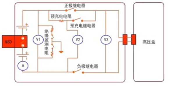 341.下图为某品牌纯电动汽车动力电池管理系统( )内部原路图,此时BMS正处于为负载上电的预充电阶段,当V2>V3,预充继电器()。