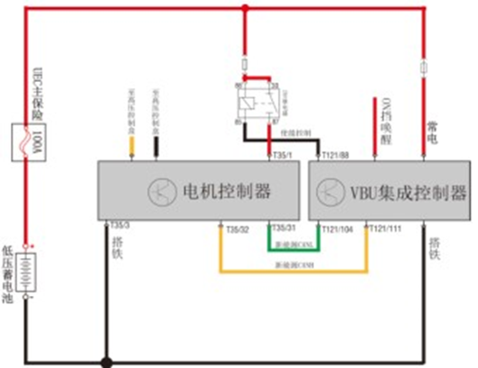 334.新能源电动汽车电路如下图所示,其中由点火开关ON档通过ON档继电器供电的部件有()