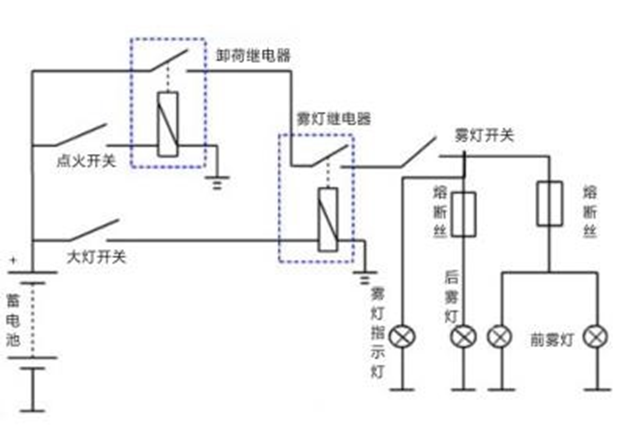 332.前雾灯工作电路如下图所示,如果要打开前雾灯需要先开()开关,使()继电器工作。