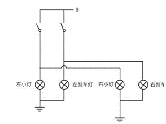 317.汽车刹车灯电路和小灯(尾灯、示宽灯)电路如下图所示,控制该两灯的开关()位