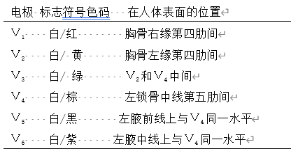 **胸导联电极的标识、颜色和位置如下:**