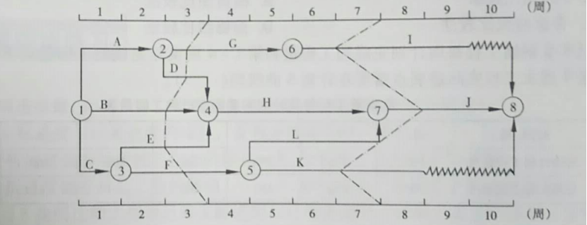 706.某工程双代号时标网络计划执行到第3周末和第7周末时,检查其实际进度如下图前锋线所示,检查结果表明( )。