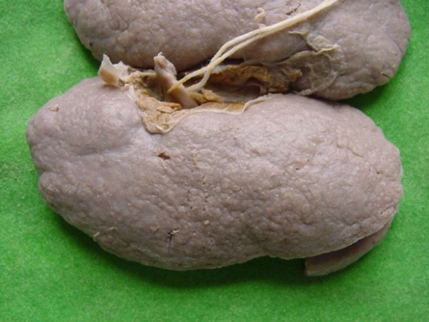 138.如图,下列脾梗死的形态特征哪项是错误的