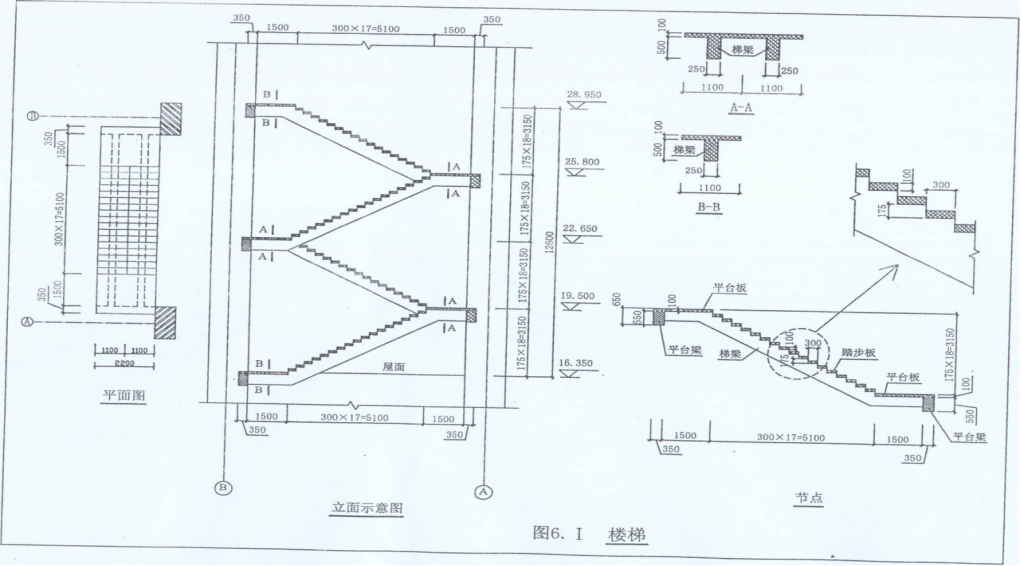 2.( )按照《建设工程工程量清单计价规范》 的规定,列式计算现浇混凝土直形楼梯的工程量(列出计算过程)。(2)施工企业按企业定额和市场价格计算出每立方米楼梯现浇混凝土的人工费、材料费、机械使用费分别为:165元、356.6元、52.1元。并以人工费、材料费、机械使用费之和为基数计取管理费(费率取9%)和利润(利润率取4%)。在答题纸表6.I.2“工程量清单综合单价分析表”中,作现浇混凝土直形楼梯的工程量清单综合单价分析(现浇混凝土直形楼梯的项目编码为010406001)。