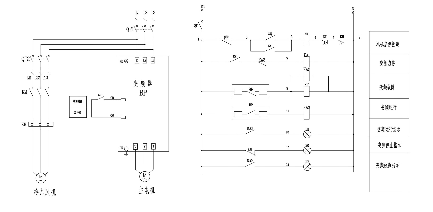 12、今一用户需一台220KW变频器控制柜,主电机为变频电机,配有一台0.75KW冷却风机,控制要求如下:( )本柜控制、显示,(2)冷却风机运行,主电机运行,(3)冷却风机故障,主电机停机,(4)主电机故障,冷却风机运行10分钟后停机。设计一次、二次原理图。(15分)