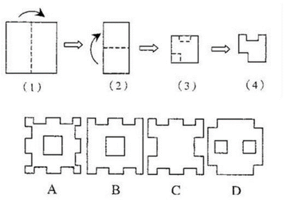 22、将一正方形纸片按下图中(1)、(2)的方式依次对折后,再沿(3)中的虚线裁剪,最后将(4)中的纸片打开铺平,所得图案应该是下面图案中的()。