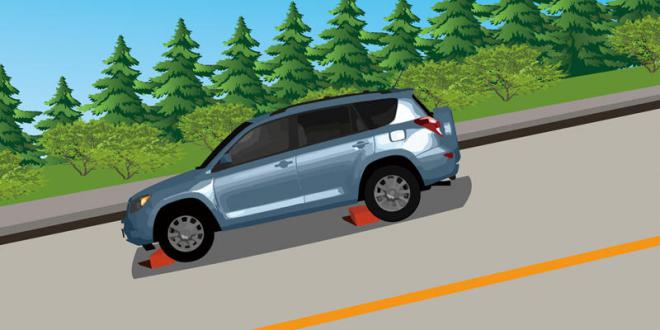 614.如图所示,因故障在山区下坡路段长时间停车时,要用这种办法塞住车轮。(图5.2.13)