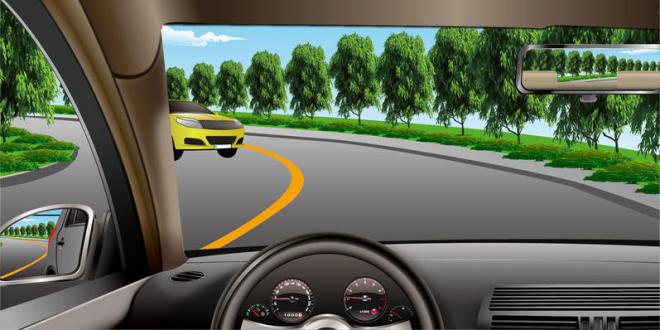 421.如图所示,弯道会车时要充分减速靠右行驶。(1分)
