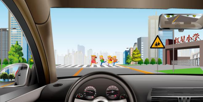 390.如图所示,驾驶机动车在学校门口遇到这种情况怎样行驶?