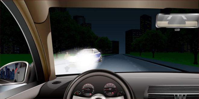 297.如图所示,夜间会车遇到这种情况要警惕两车前照灯交汇处(视线盲区)的危险。