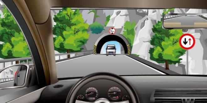 209.如图所示,驾驶机动车遇到这种情况,应在隧道口外靠右让行。