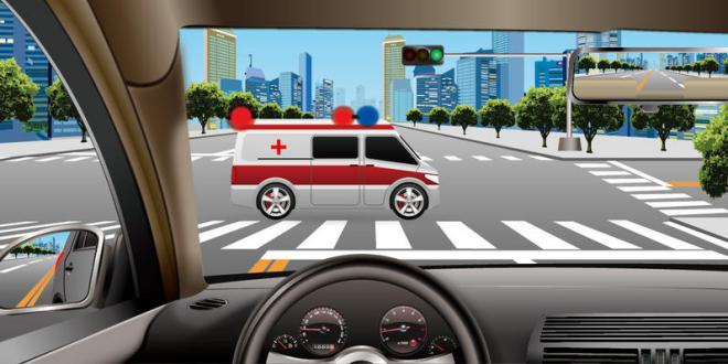 79.如图所示,驾驶机动车遇到执行紧急任务的救护车时,以下做法正确的是什么?