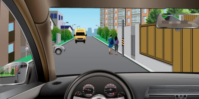 74.当驾驶车辆行经两侧有行人且有积水的路面时,应怎样做?(1分)