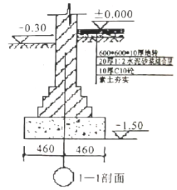 2.背景:某条形砖基础平面、剖面图如下所示,墙厚240,轴线居中标注,施工说明如下 (1)本工程建设方记完成三通一平,原地面高程与设计室外地面高程相同,土壤为二类土; (2)本基础工程土方为人工开挖,挖土深度1.2m,不考虑工作面和放坡系数; (3)室内地面做法为:素土夯实,100厚C10砼垫层,20厚1:2水泥砂浆结合层贴, 600*600*10厚地砖,顶面标高为±0.00。 请计算:(1)平整场地清单工程量; (2)挖基础土方清单工程量; (3)室内回填土方清单工程量。