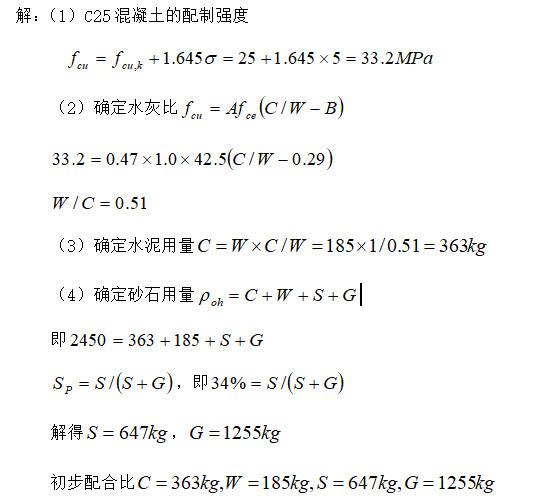 13.【计算题】设计某非受冻部位的钢筋混凝土,设计强度等级为C25。已知采用42.5强度等级的普通硅酸盐水泥、质量合格的砂石,砂率为34%,单位用水量为185kg,假设混凝土的体积密度为2450 kg/m3,试确定初步配合比( )。