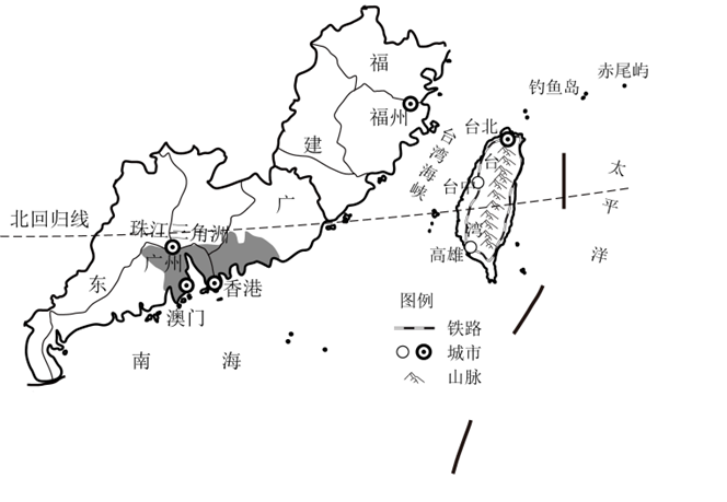 19. 图是我国珠江三角洲和港、澳、台地区分布示意图。完成下面小题。