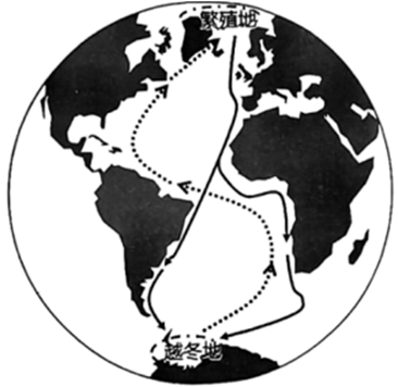 11. 北极燕鸥是世界上已知迁徙距离最长的动物,当北半球夏季时,在北极圈附近繁殖后代,随着气温降低,它们开始长途迁徙到南极越冬,每年在两极之间往返一次。图为“北极燕鸥迁徙路径图”,完成下面小题。