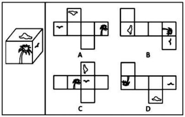 371.下图右框内纸盒的外表面中,不能折叠成左框内所示的纸盒的是:( )。