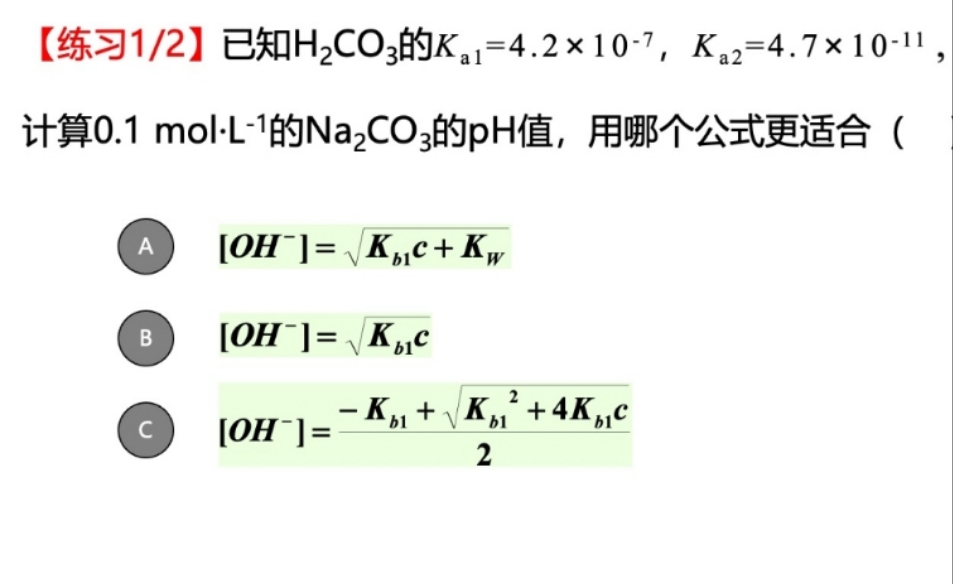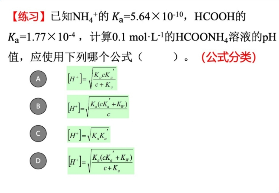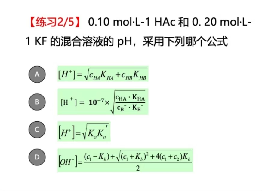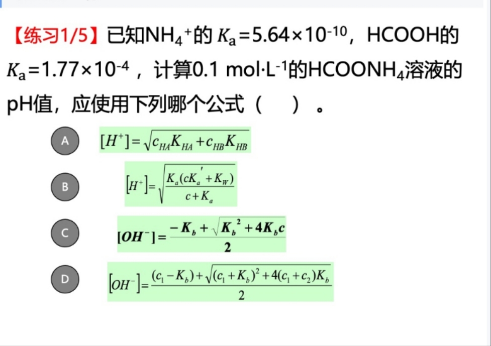 null乙酸的pKa=4.74,在pH=4.0时其主要存在型体是()当pH=5.00时,0.20mol/L的二元弱酸H₂A溶液中,H₂A的浓度为()(设H,A的pKa1=5.00,pKa2=8.00)NaHCO₃溶液的电荷平衡式为()下列哪项为(NHa)₂HPOs在水溶液中的质子平衡式:当pH=8.00时,0.20mol/L的二元弱酸 H₂A溶液中,H₂A的浓度为()。(设H,A的pK=5.00,pK=8.00)某弱酸HA的解离常数K=1x10-5,则其0.1 mol/L的水溶液的pH=?计算0.01 mol/LCHCOOH溶液和等体积0.01 mol/L NaOH溶液的pH,使用哪个公式最合适()