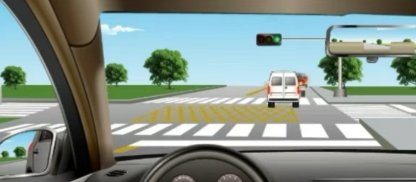 如图所示,当驾车在路口直行遇前方道路拥堵时,你应如何安全驾驶?