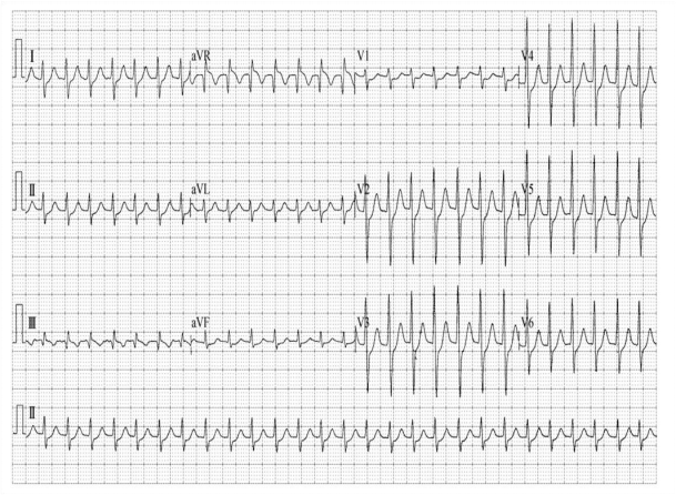 195.患者男性,59 岁,高血压病史 4 年余,近 1 月活动后有胸骨后闷痛感,休息可缓解。今因情绪激动又 感胸骨后疼痛,听诊心率为 120 次/分,心电图检查如图所示,应考虑为