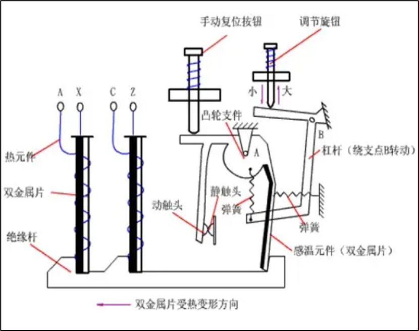 4、请根据热继电器内部结构图,分析热继电器在进行过载保护动作时,机构各元件的动作顺序(含复位操作)。