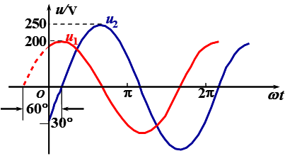 3、已知选定参考方向下正弦量的波形图如下图所示,U1、U2正弦量的表达式分别为()。