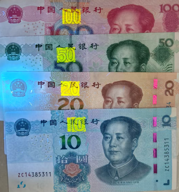 1、在紫外光下,第五套人民币50元、10元和1元的无色荧光特征呈现()。