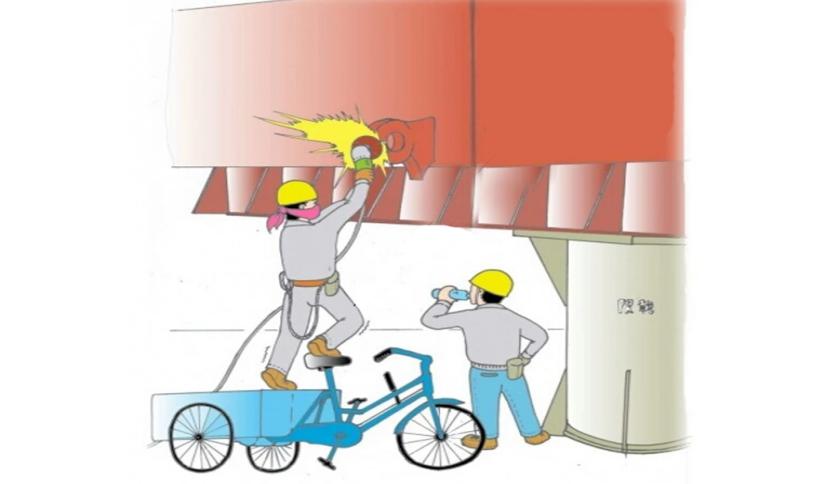 97、图中职工正在现场进行角磨机切割作业。请辨识选项中符合违章行为的描述( )