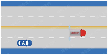 1527. 如图所示,驾驶过程中遇到这种情况时,A车可以长鸣喇叭提醒道路养护车辆暂停喷水。