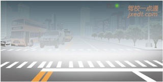 1497. 如图所示,在这种雾天情况下,通过交叉路口时必须开灯、鸣喇叭,加速通过,以免造成交通拥堵。