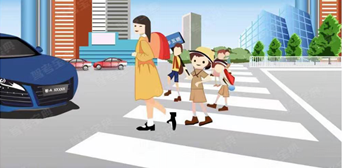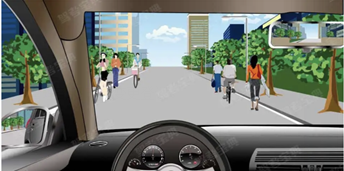582. 如图所示,驾驶机动车遇到这种情况,可以轻按喇叭提醒前方非机动车和行人后方有来车。