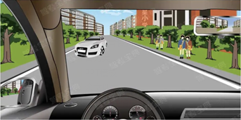 375. 如图所示,驾驶机动车遇到这种情况,不仅要控制车速留出会车空间, 而且要注意与右侧的儿童保持足够的安全距离。