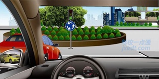 290. 如图所示,在这种情况下准备进入环形路口时,为了保证车后车流的通畅,应加速超越红车进入路口。