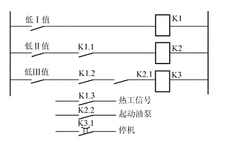 3、根据运行要求,汽轮机在润滑油压低Ⅰ值时发热工信号;低Ⅰ、Ⅱ值时启动备用油泵;低Ⅰ、Ⅱ、Ⅲ值时延时停机。试画出一简单的控制原理图( )。