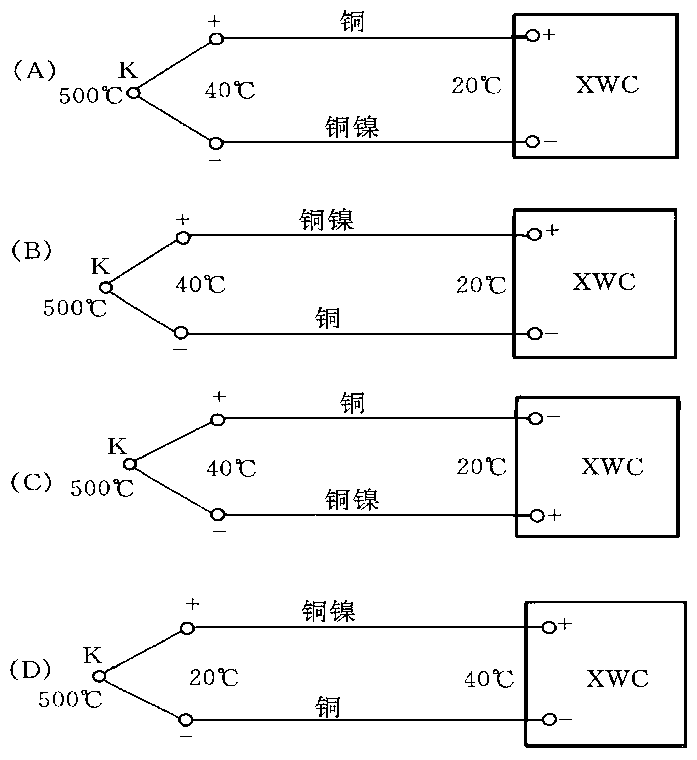 40、图A-10所列的四种热电偶测温系统的连接方式,只有( )接法才是实际安装中的正确接法。