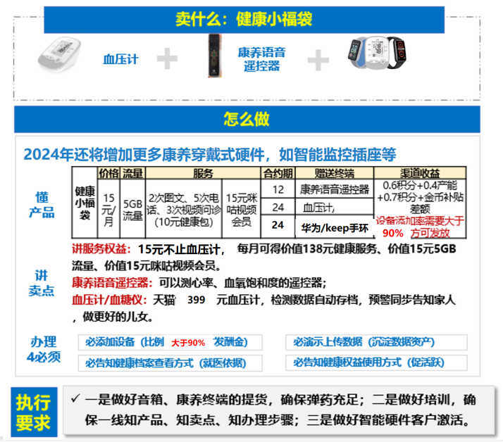 2、爱家健康功能( )智能自诊卖点:高清盒智能自诊功能是截止AI人工智能技术、语音识别技术,通过语音交互的方式与客户互动,了解病情,并初步判断病因并推荐问诊科室。当客户不知道头疼、脚肿等不知道该挂什么科的时候可以使用智能自诊。智能自诊的AI豹豹医生问诊时的非常细致。豹豹医生以优异成绩参加国家临床执行医师资格考试综合笔试,考试成绩超过同期96.3%人类考生。智能自诊也可以辅助基层医生,经实践,智能自诊让基层医生的诊断合理率从70%提升至90%。目前,智能自诊服务客户复用率超过35%。(2)预约挂号卖点:预约挂号是与医院的系统连接,实现线上预约挂号服务。服务收费均与医院现场预约挂号收费一致。目前,中国移动云南APP、和家亲APP中预约挂号可提供超120家医院预约挂号服务,涵盖昆明所有三甲医院。高清盒爱家健康预约挂号可提供11家医院预约挂号服务,其中7家昆明三甲医院,1家楚雄州人民医院、1家玉溪市人民医院、2家文山三甲医院。(3)在线问诊连续月包资费如下:单次在线问诊服务目前已支持11家云南省内医院在线问诊服务,涵盖约2900个医生。在线问诊费用由医生自主定价。(4)心率检测客户购买康养语音遥控器后,即可通过高清盒——爱家健康——心率检测模块通过康养语音遥控器对心率、血氧饱和度等指标进行检测。(5)报告查询中国移动云南APP、和家亲APP的爱家健康——健康档案——查报告,上线了云南昆明最有影响力的11家三甲医院报告查询服务,实现医院检验检测报告可查、可看,提升效率,降低客户重复检测检验成本。(6)购药送药爱家健康——送药到家可链接至一心到家实现覆盖10000多家药店的购药送药服务,实现了在客户住所最近的药店下单后一个小时内的送药上门服务,真正实现足不出户的就医问诊闭环服务。(7)名医直播每周三下午6:30-7:30上线一场云南省三甲医院副主任以上级别的医师直播服务,涵盖各类医学学科知识。以上产品除预约挂号、购药送药、在线问诊需要根据情况收费外,其余均免费提供,所有客户均可使用。(8)健康小福袋活动