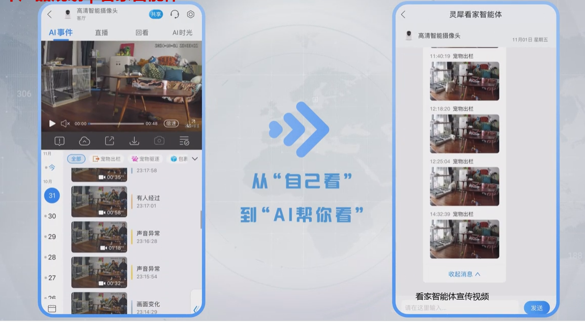 (4)“灵犀”看家智能体智能体基于“小模型+语言大模型”,实现全AI事件的视频理解、检索、总结和定制化推送。智能体可精准理解用户意图,以自然语言交互升级传统的告警查看模式,让用户从“自己看”转化为“帮你看”,后续将从“被动交互”到“主动交互”。例如:可以在移动爱家APP内,请“灵犀”直接帮你看看——今天老人几点出门?——小朋友是否在家里玩手机?——宠物是否出栏了?——婴幼儿今天哭了几次?