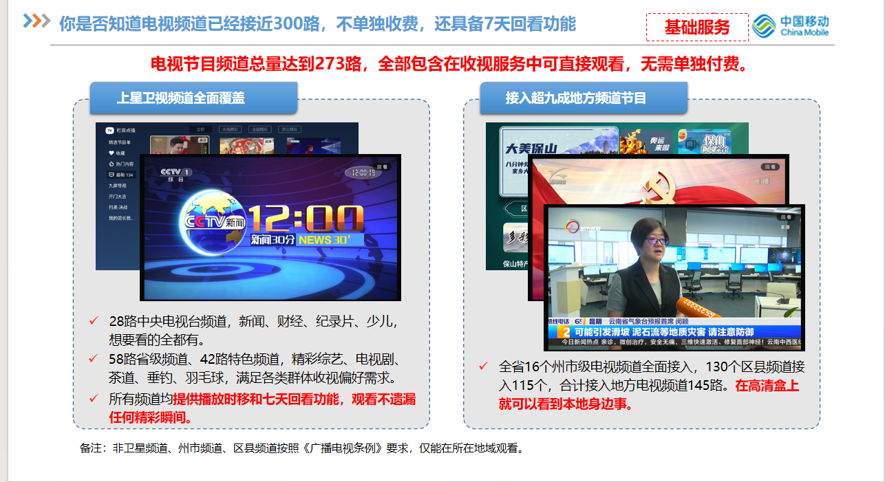4、一个家( )——泛屏:提供云南最大的内容分发服务,以大屏/中屏用户规模和内容规模为基础,用户可在电视/音箱上进行高清电影、电视剧和精选栏目的点播,同时可进行云端应用的互动的家庭泛屏产品。