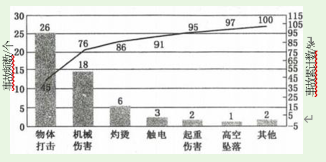 【2021年 ·单选】常用的事故统计分析方法有综合分析法、统计图表法等。某企业绘 制了以下事故类型、事故频数、事故累计数的统计图。该图采用的事故统计分析方法 是 ( )。