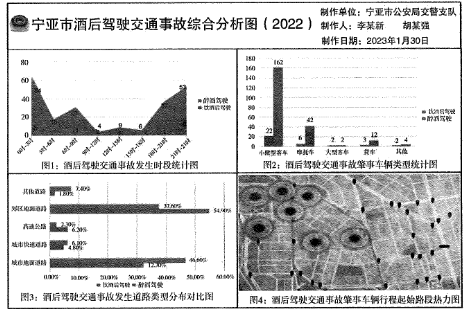 20.六、根据以下情境材料,回答第19~22题。2022年是“醉驾入刑”的第11年, “喝酒不开车,开车不喝酒”的理念逐渐深入人心,但仍然有人心存侥幸、以身试法,宁亚市公安局交警支队全年组织近百次酒后驾驶(含饮酒后驾驶和醉酒驾驶)专项治理活动,实现酒后驾驶引发的交通事故连续5年下降。为了精准查处酒后驾驶违法行为,交警支队梳理分析了2022年的数据,撰写了“宁亚市酒后驾驶交通事故综合分析报告(2022)”,绘制了相关数据的分析图(见下图),通过数据引领,实现精准查处和有效防范。(2023年多省联考)