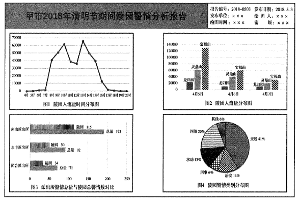 5.二、根据以下情境材料,回答第5~7题。2019年清明前夕,甲市公安局情报中心根据《甲市2018年清明节期间陵园警情分析报告》,对2019年清明节期间全市陵园(宝福山、灵鼎山、龙归园,分别对应管辖派出所为南山派出所、永丰涨出所、团合派出所)社会治安状况进行预测,并提出工作建议。(2019年多省联考)